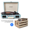 The one, the only, the original, Crosley Cruiser. Lightweight in its charming suitcase-style shell, its easy to use and a delight to hear. With pitch control, built-in speakers and NOW with Built-in Bluetooth receiver; stream your music via your phone to the improved stereo speakers of the turntable. Easily Switch to built-in Bluetooth transmitter and experience your records on your own wireless speakers or headphones. The Cruiser is ready to jam vinyl or your digital music. Choose from a rainbow of sound to start your vinyl adventure with this portable three-speed record player. Crosley Cruiser Bluetooth Portable Turntable - Portable Turntable, Belt Driven Turntable Mechanism, Plays 3 Speeds - 33 1/3, 45 And 78 RPM Records, Built-in Bluetooth Receiver and Bluetooth Transmitter (Connects to Bluetooth Speakers) , Auxiliary Input, Headphone Jack, RCA Audio Out, Adjustable Pitch Control, 6\" Full Range Speaker. Crosley Record Storage Crate Go crate-digging through your own collection with Crosleys rustic wooden record crate. Fire-branded with the iconic Crosley logo this lightweight crate gives plenty of room to fill it with precious LPs. Product Features Integrated Carry Handles Holds approximately 75 albums Finished In Solid Wood