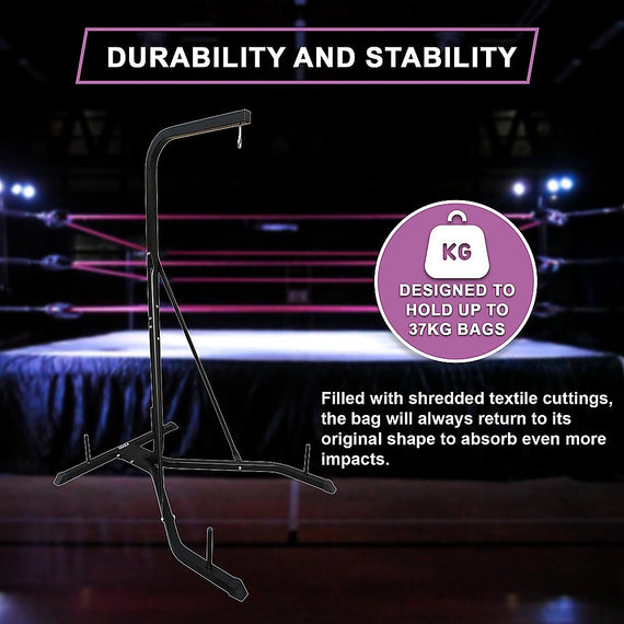 The punch bag stand features dimensions of 218 x 165 x 165cm (H x D x W). It features an all-steel frame for exceptional durability and stability. Assembly is straightforward, and everything you need is included.