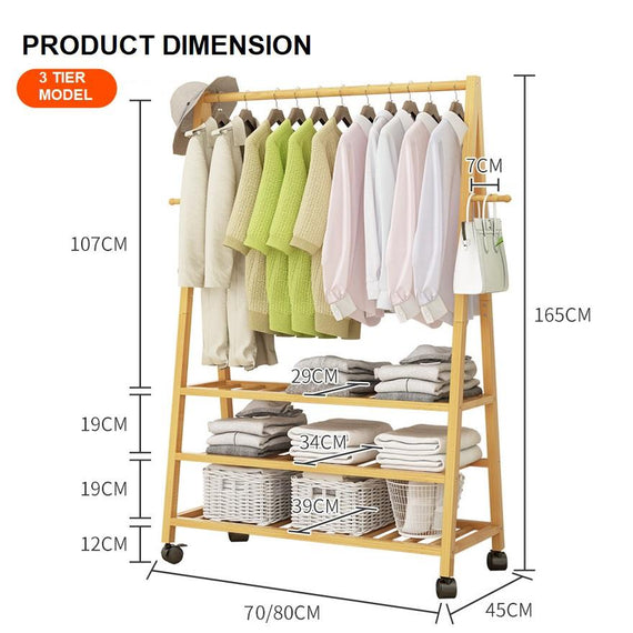 Rail Bamboo Clothes Rack Garment Hanging Stand 3 Tier Storage Shelves Closet 80cm Panel