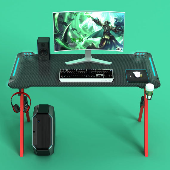 RGB Gaming Desk Home Office Carbon Fiber Led Lights Game Racer Computer PC Table Y-Shaped Red New 140cm